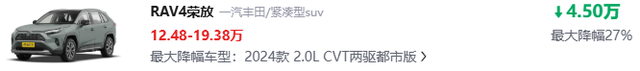 造型设计相比本田CR-V,更加显得有运动感,但是尺寸稍微小一些,配置方面两台车是差不多的。现在最大降幅比例27%,售价下调4.5万,裸车起步12.48万,顶配19.38万,相比CR-V稍微贵一点点。同样会提供燃油车,还有油电混动版可以选,这款车去年总销量卖出19.3万台,比本田CR-V还稍微高一点点。